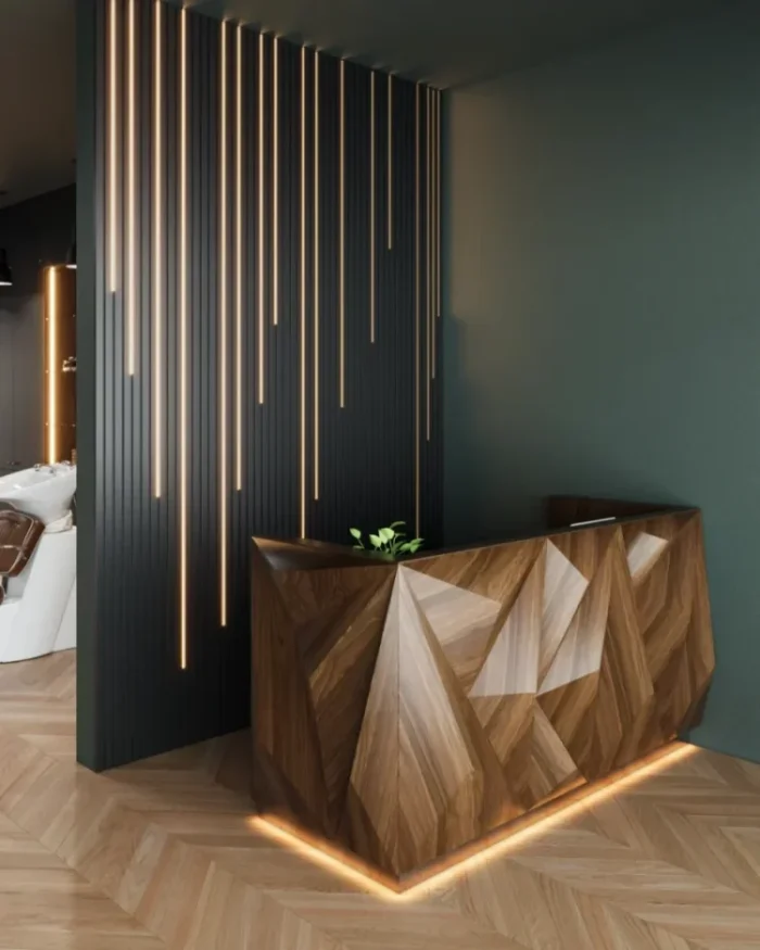 Dark wood paneling, Brass fixtures, Leather seating, Professional layout, Vintage-modern aesthetic, Functional design
