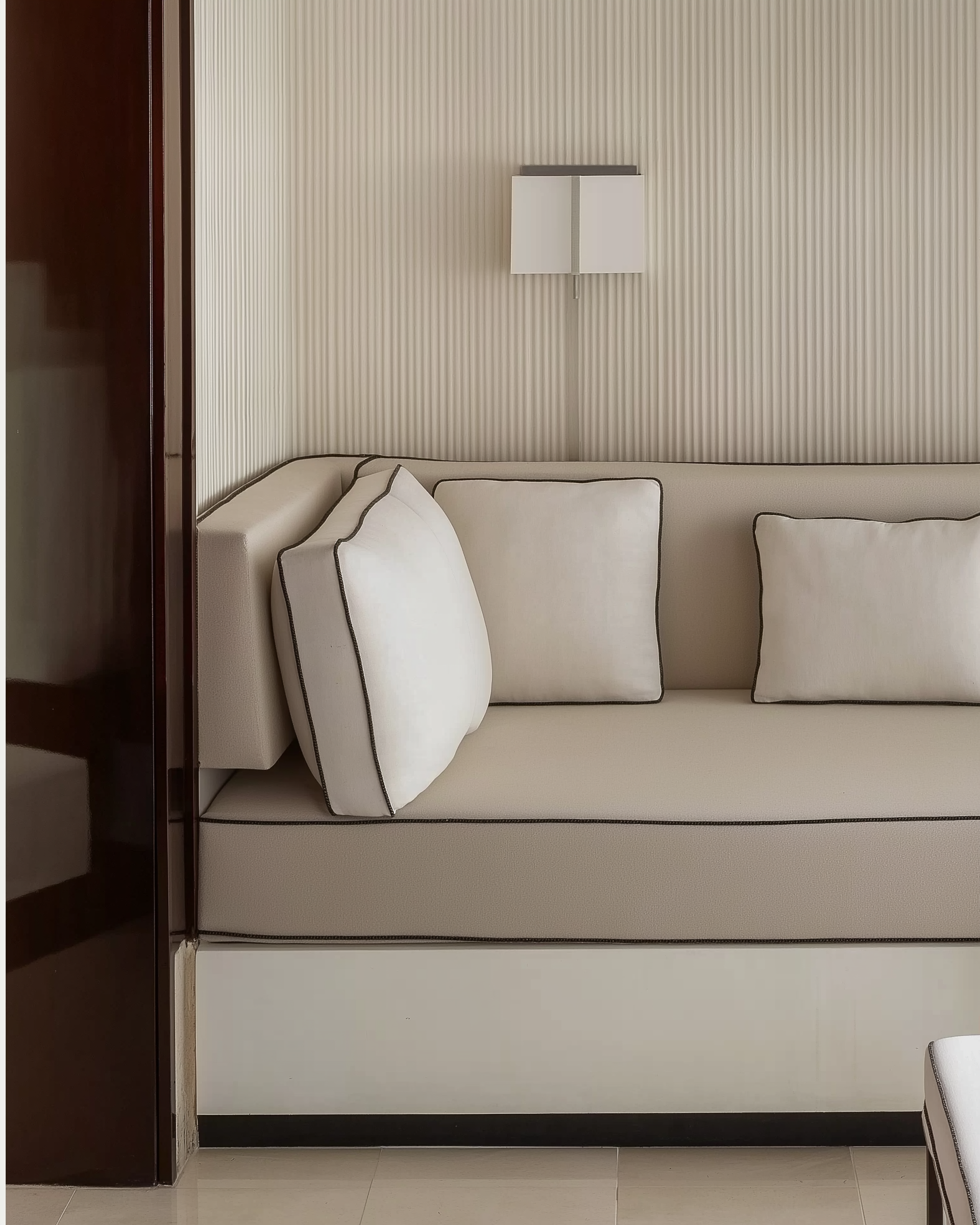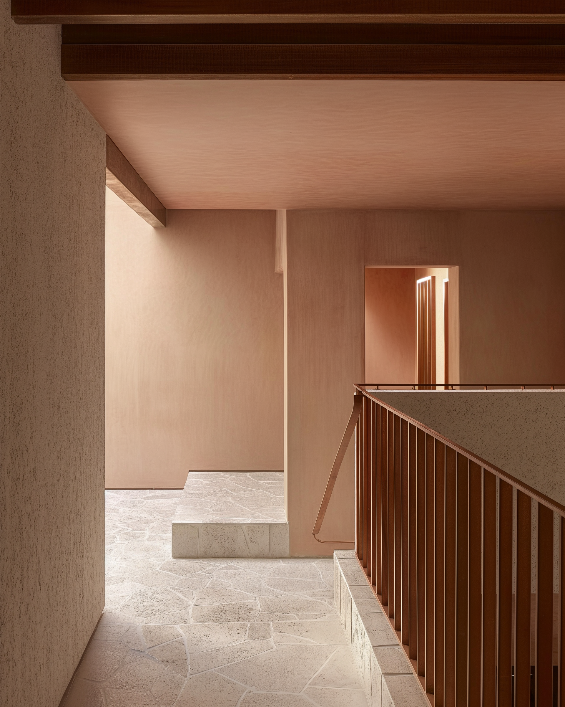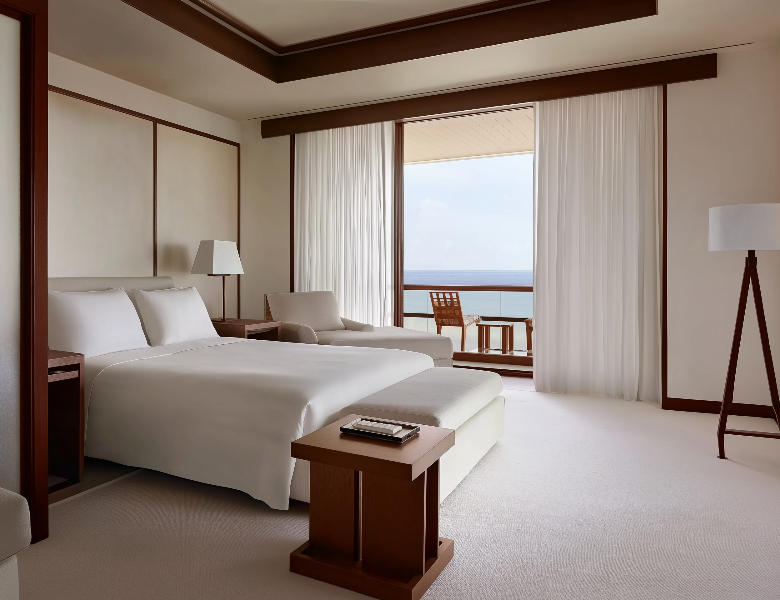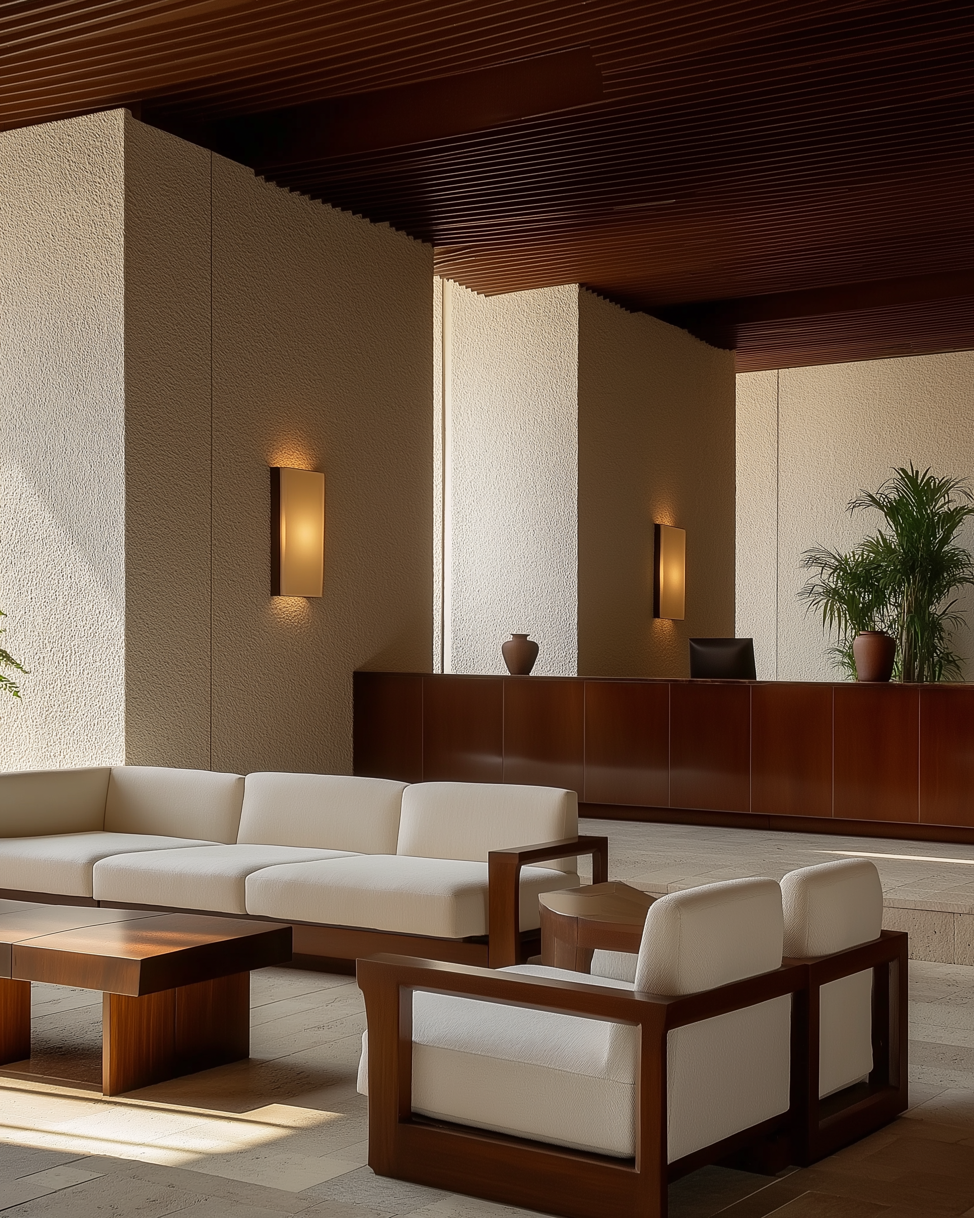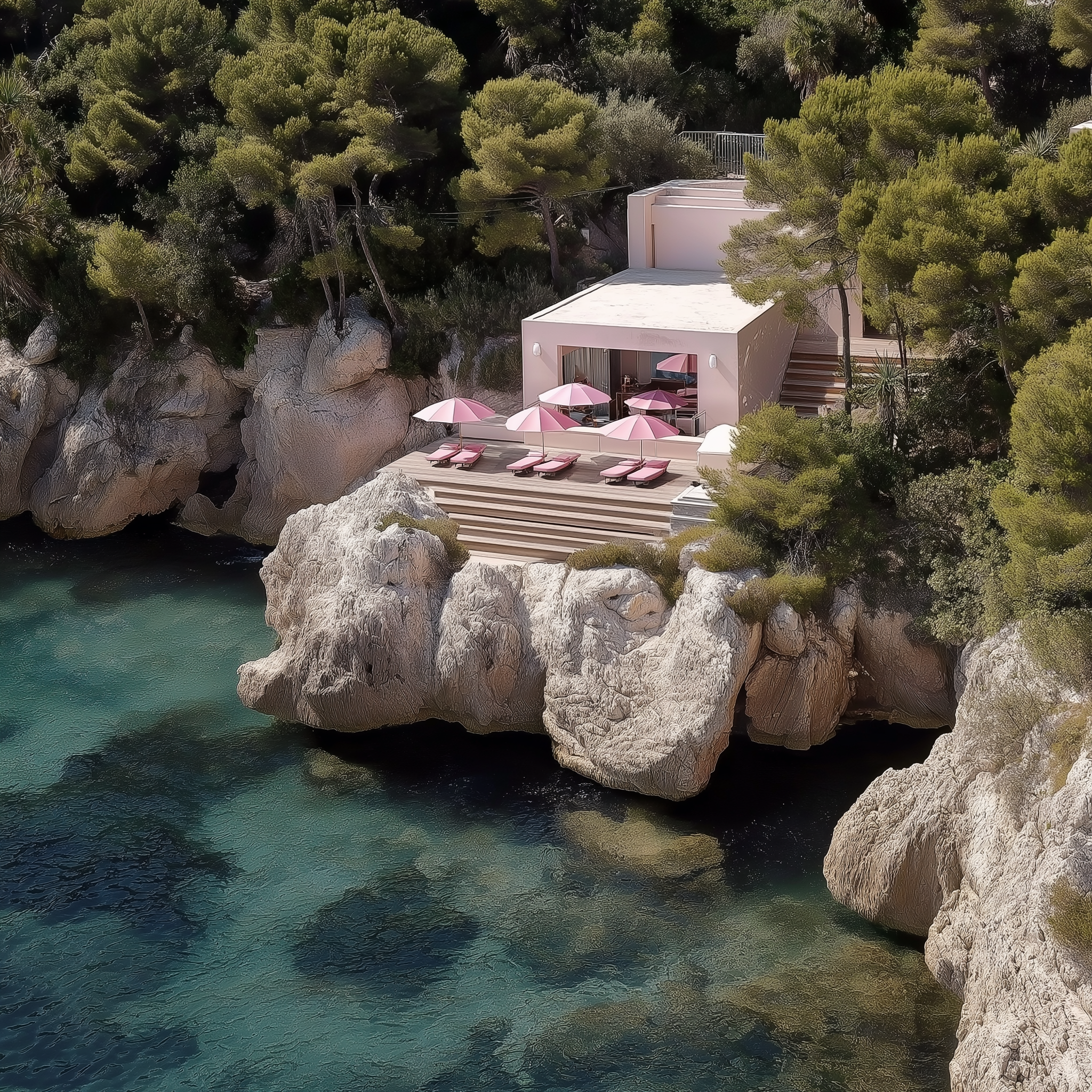 Where the cliffs fall straight into the sea, we built. Not against the rock — with it. A mid-century structure of white render and lacquered mahogany, with limestone floors that carry the landscape inside without asking permission.