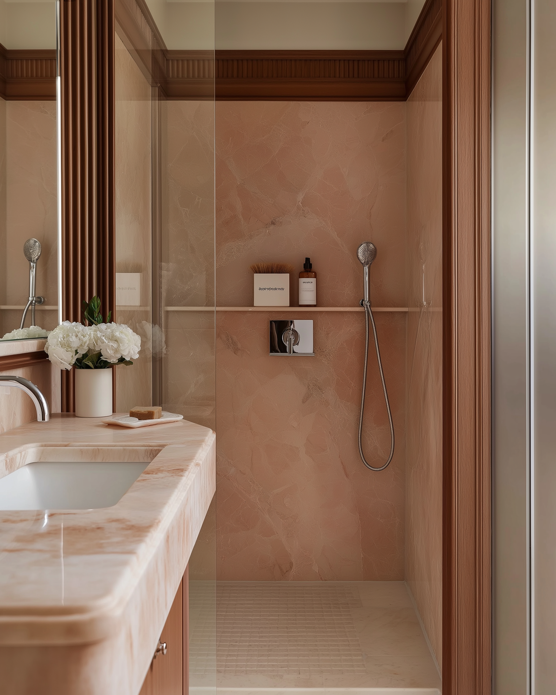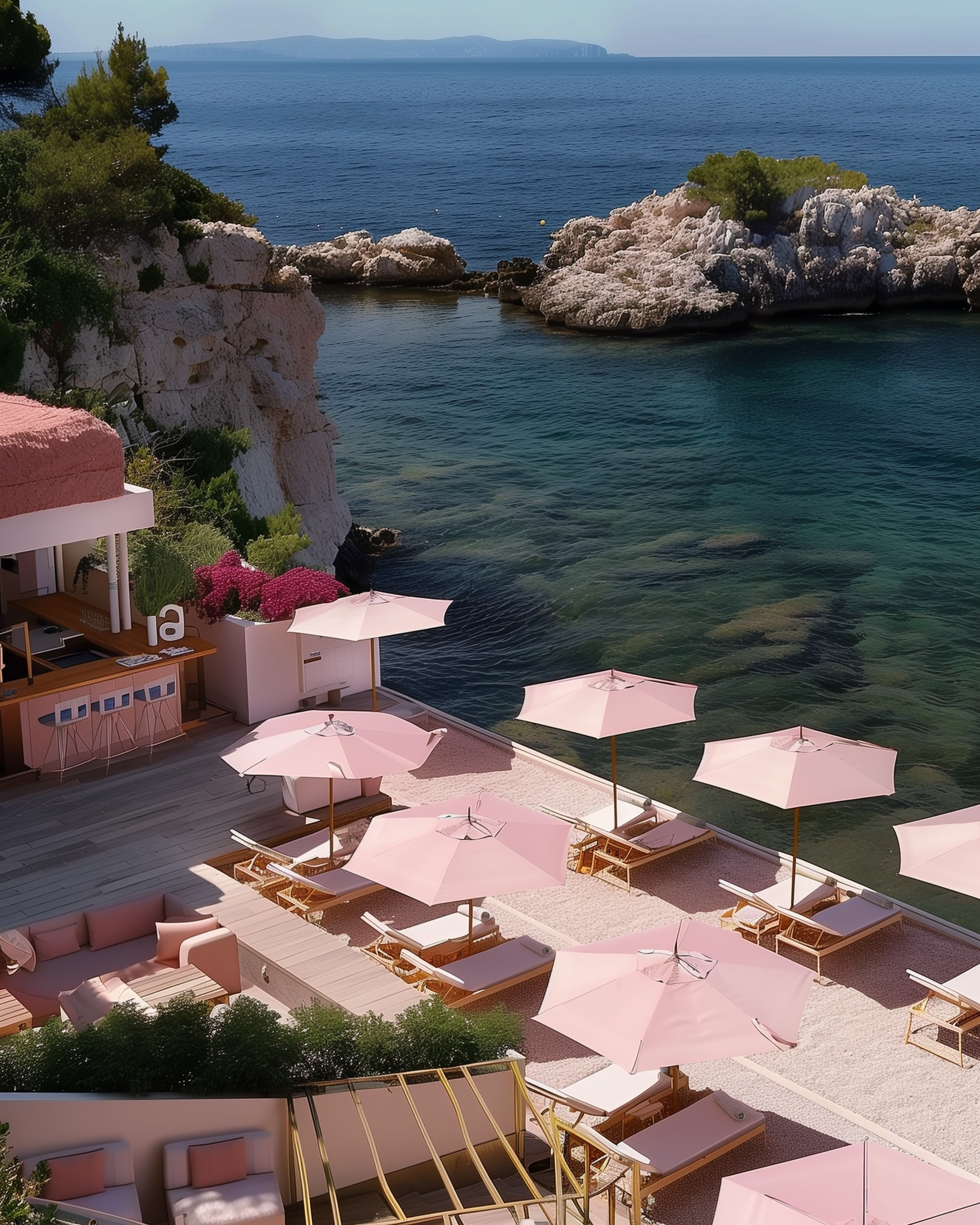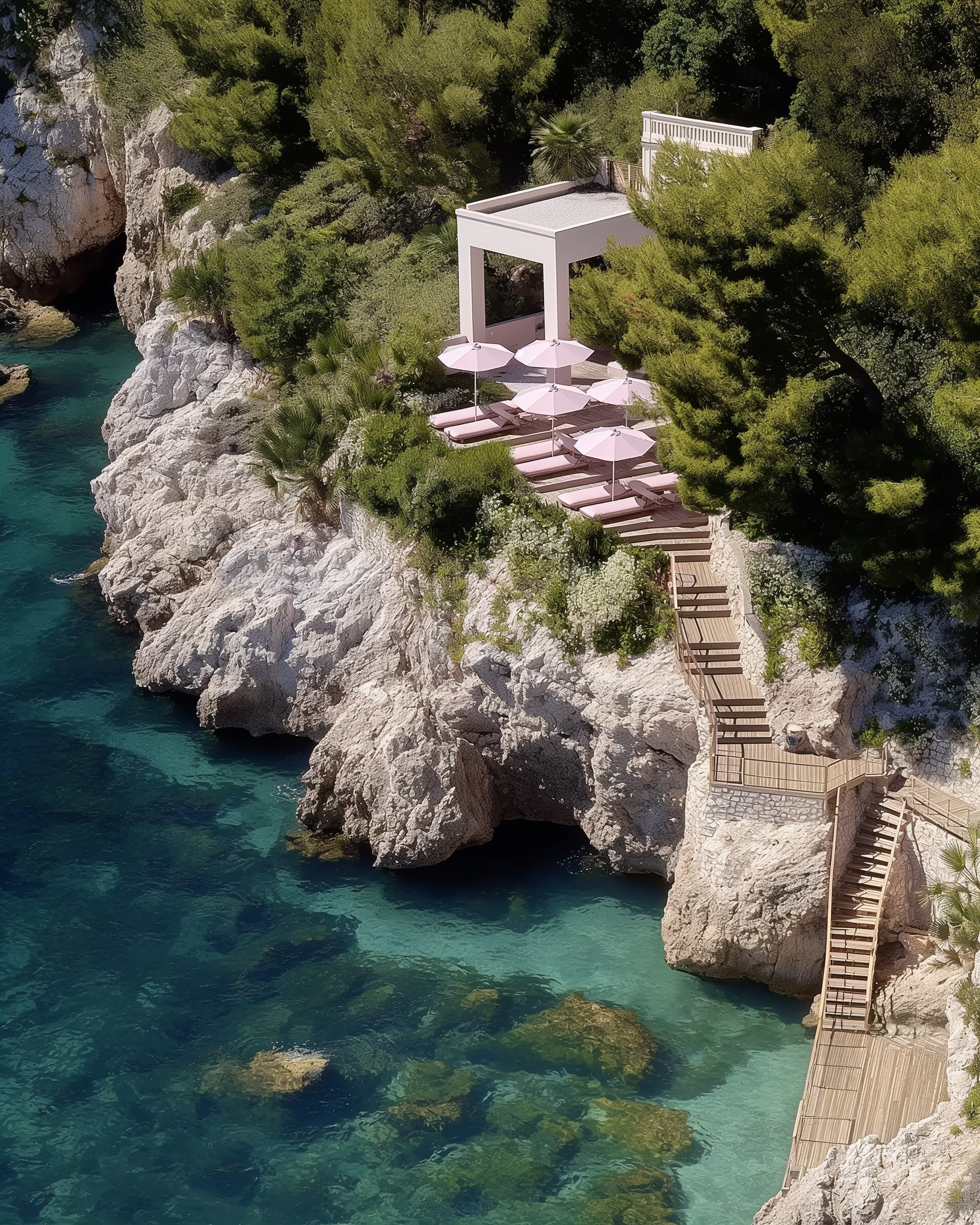 Rosa Portogallo marble, veined and luminous, wraps the bathrooms. Breuer-inspired caramel leather chairs anchor the rooms and the Michelin-starred restaurant — while pink umbrellas and towels line the decks above turquoise waters.