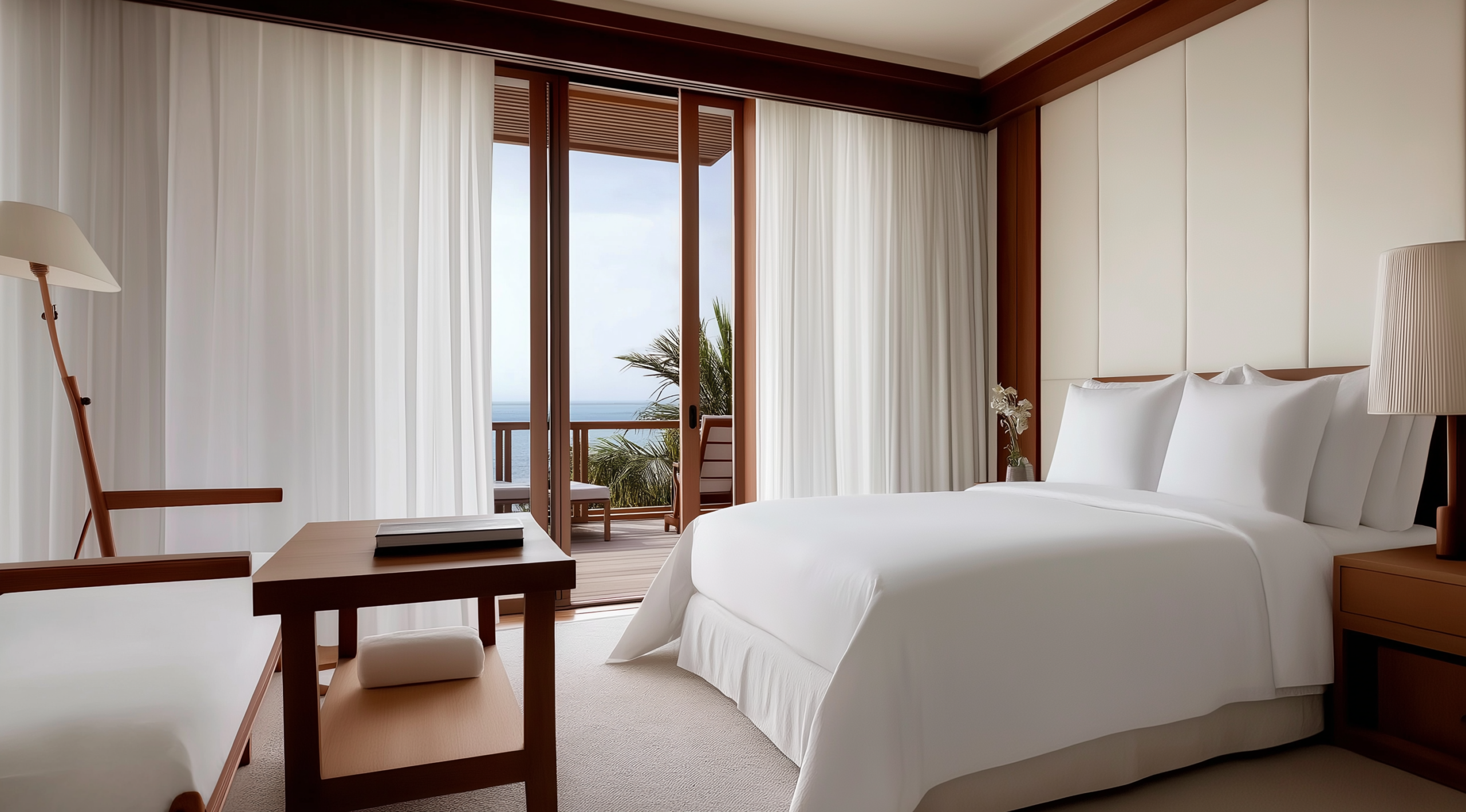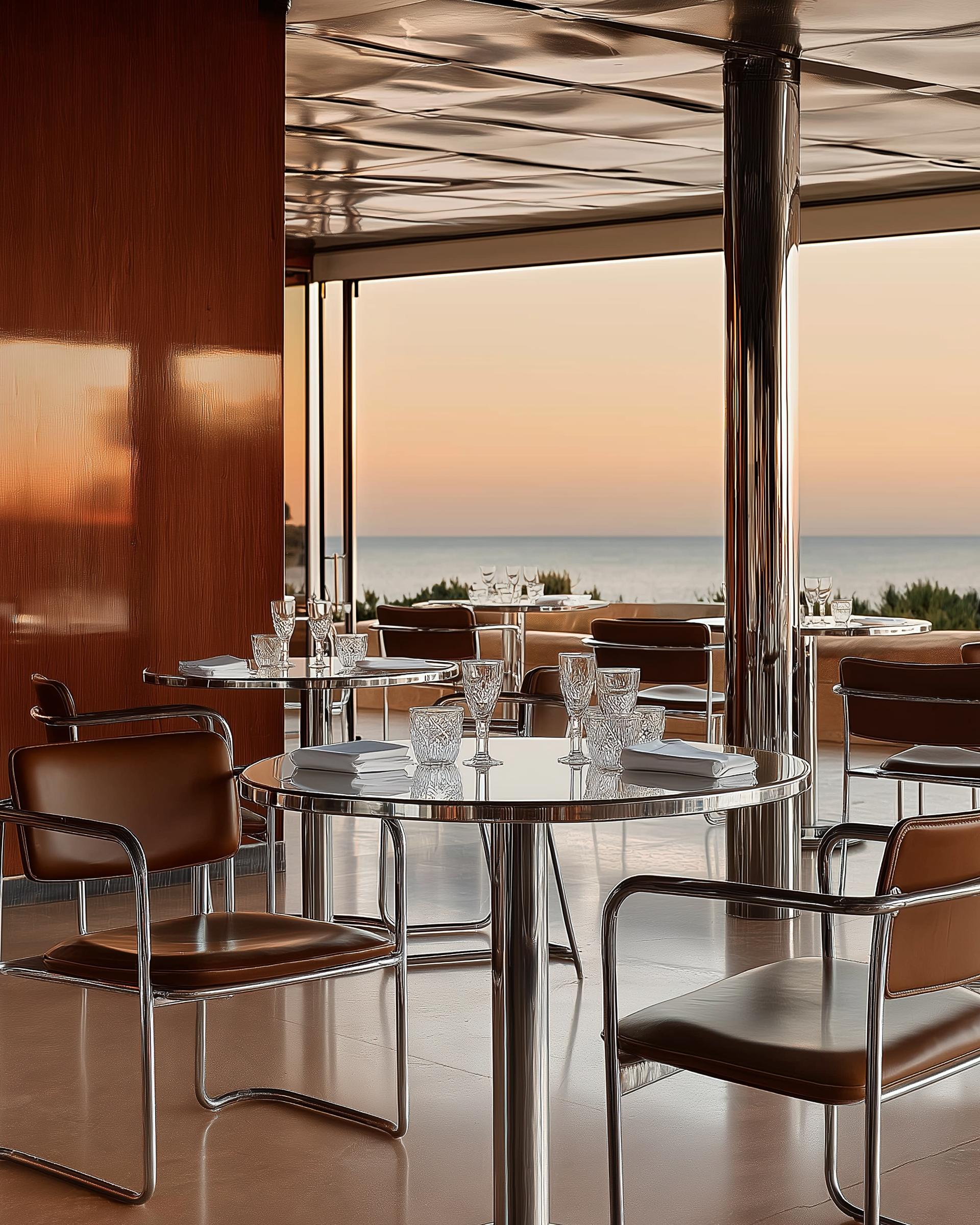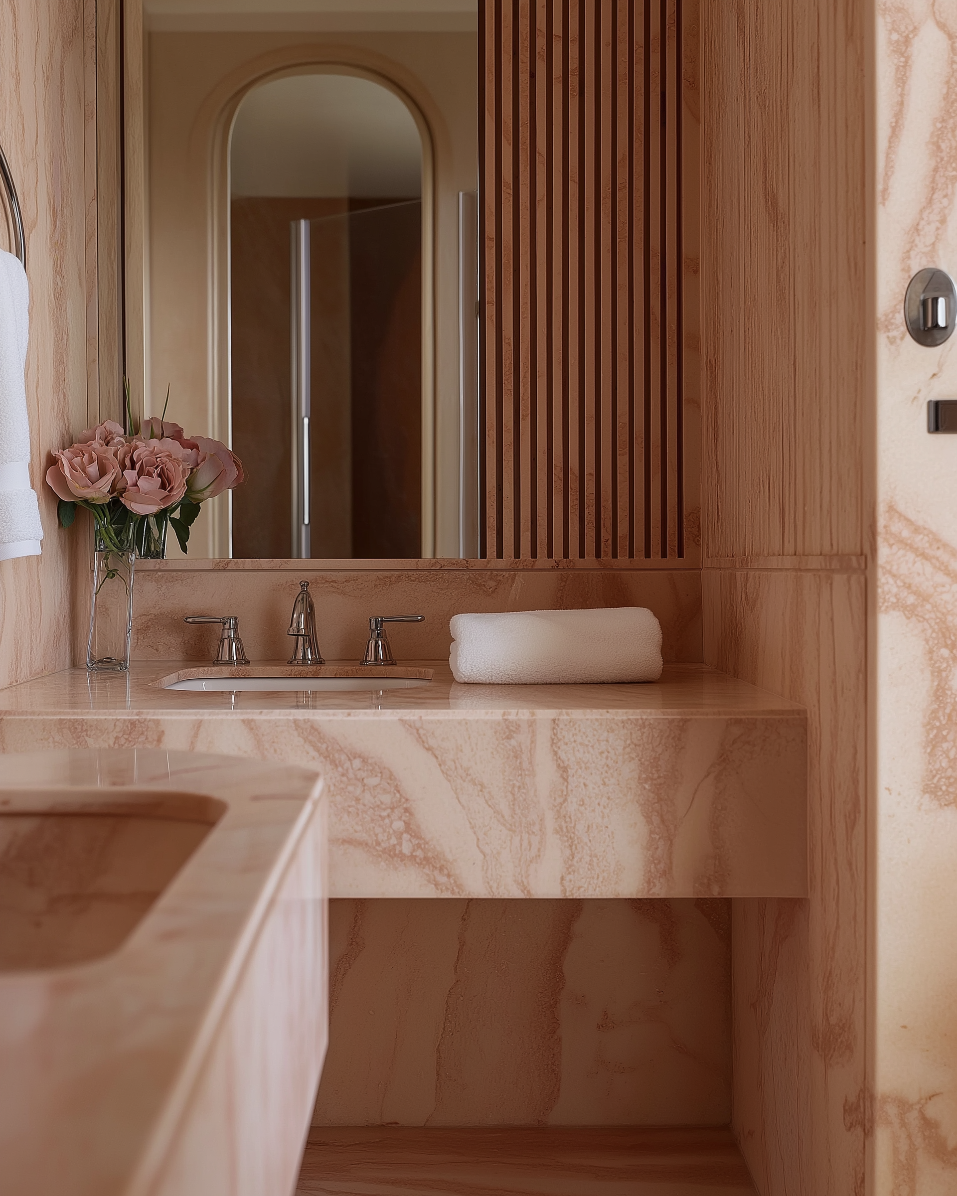Rosa Portogallo marble, veined and luminous, wraps the bathrooms. Breuer-inspired caramel leather chairs anchor the rooms and the Michelin-starred restaurant — while pink umbrellas and towels line the decks above turquoise waters.